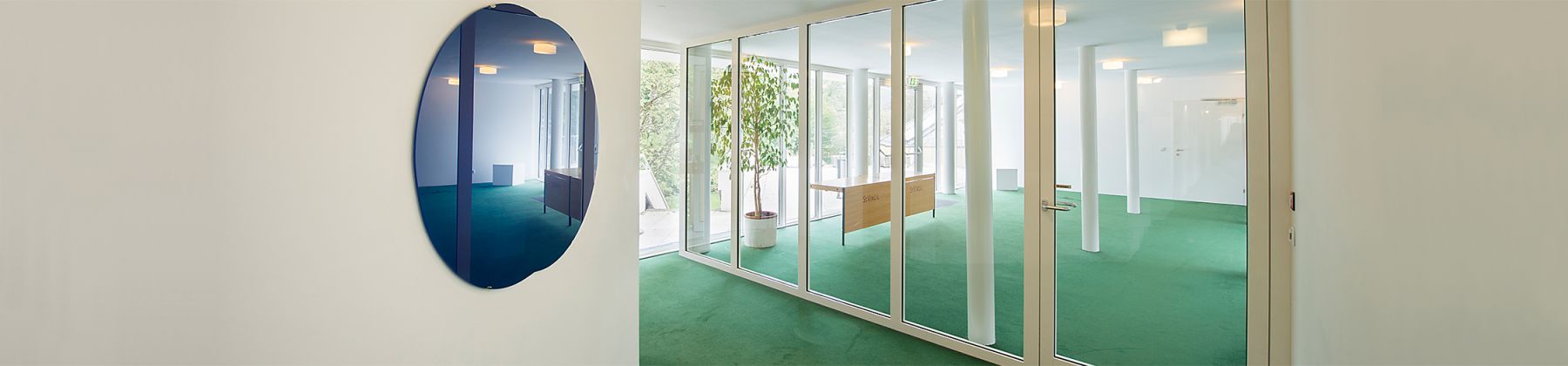 Was ist das erste, das zweite? Wo finde ich den Anfang, wo das Ende? Die Frage nach Einheit und Vielheit und die Frage nach Harmonie sind Fragen, die sich in den damals entstandenen Arbeiten von Sabina Laven wiederfinden. Insbesondere die „Zirkelkonstruktionen“, die sich in Brunos Werken finden, wurden von ihr zerlegt und neu zusammengesetzt. Ausgehend von der Kreisform schafft sie so ihre ganz eigenen Formationen, die sie mithilfe des Materials Glas und durch eine intensive Farbigkeit eindrucksvoll ins Bild setzt. Gerade der farbige Hintergrund bewirkt unaufdringliche, aber doch lebhafte Reflexionen und Spiegelungen, die jede*r Betrachter*in zu einem Teil des Kunstwerks werden lässt und nicht greifbare Betrachtungsebenen einführt.
